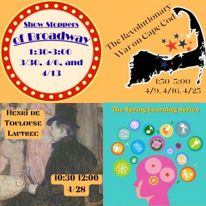 The Friends of EPL Learning Series continues its spring line-up with upcoming programs in April on Broadway Showstoppers, artist Toulouse Lautrec, World Religions and Cape Cod in the Revolutionary War. Registration is required. For more information, visit the Learning Series webpage.Â