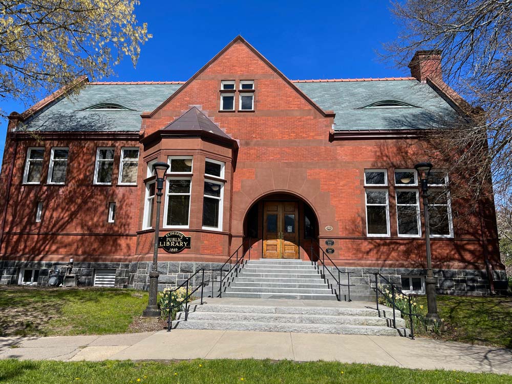 Architect Albion M. Marble of Fall River, a student of H. H. Richardson, designed the original 67' by 34' building in the Renaissance/Romanesque Revival Style, with Quincy granite foundation, red West Barnstable brick walls with pink mortar, Longmeadow brownstone trim, a slate roof with terra cotta cresting, and eyebrow dormers. The interior was finished with quartered oak wainscoting, a carved oak fireplace mantle, Italian marble mosaic in the vestibule, and two stained glass windows with solid medallion facsimiles of the marks of L. Giunta and Aldus, both early Italian book crafters.